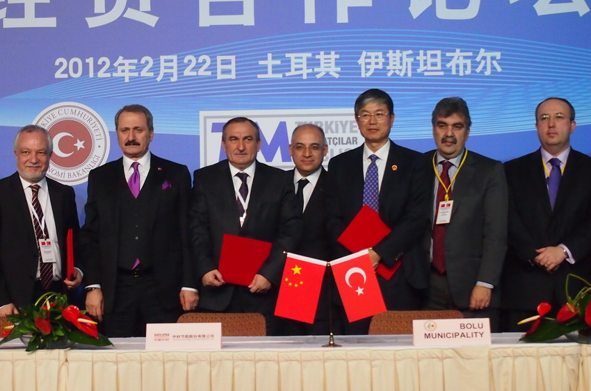 中材集團董事長譚仲明率團與來自中土兩國的企業家和各界人士500多人出席論壇。期間,譚仲明與BOLU市長Alaaddin Yilmaz分別代表中材集團及土耳其BOLU市政府簽署了合作框架協議。中國商務部國際貿易談判代表兼副部長高虎城及土耳其經濟部長恰拉揚等見證了簽約。